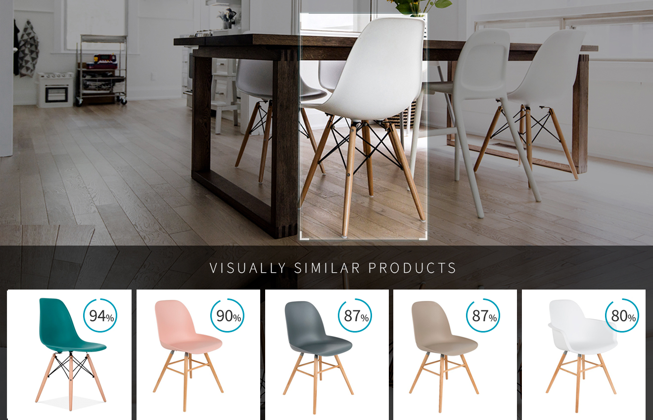 Get the most visually similar objects in your images with visual search. Simply upload your image gallery and then you can search over those images seamlessly. We return the most similar images with a similarity score.